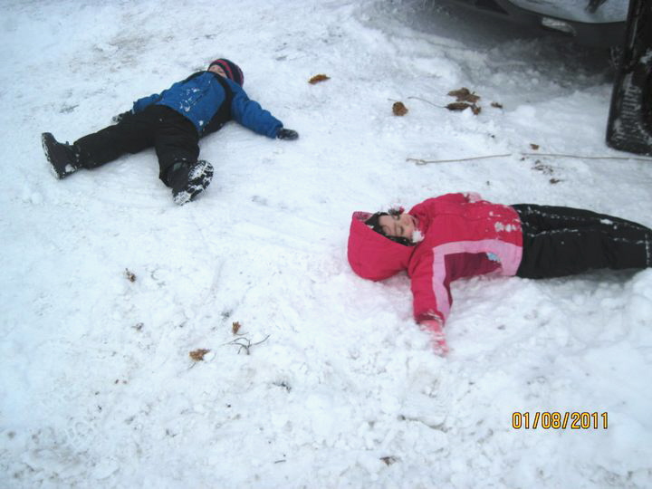As she recounted to me in the car tonight, "It was fast and the snow got all in my face and it was cold!" In hindsight, I probably should have shielded her better!Now Luke had a blast. He must have gone down that hill about seventy times! Meanwhile, after giving a try to the sledding thing, Ben and Julia were more content to just sit at the top of the hill and make snow angels!The entire weekend was such a blast! We literally played all weekend...sledding, setback, air hockey, bowling and even castles and dragons (and who knew Jules would be so fond of dragons!).